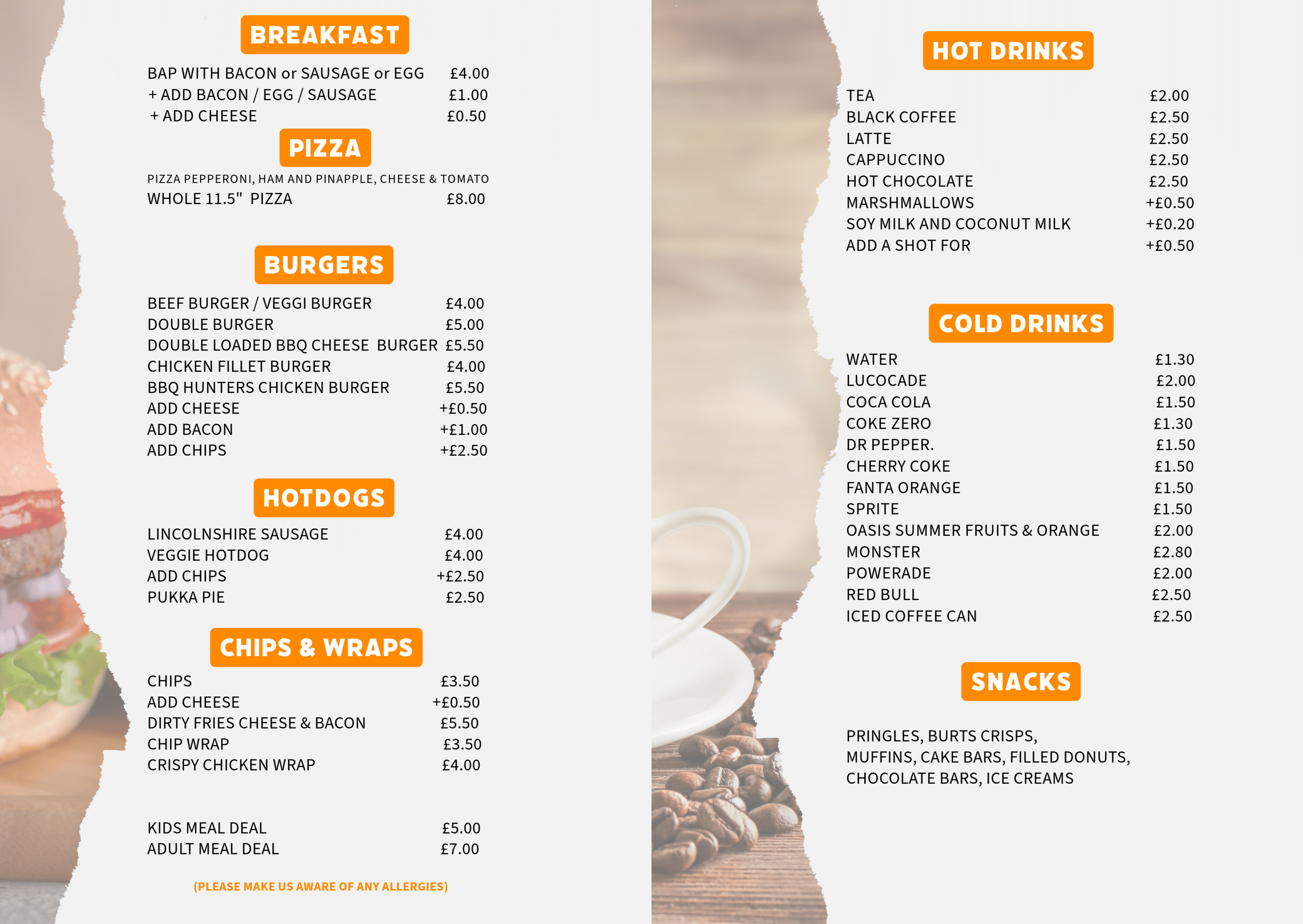 Hotdogs, Beef Burgers, Vegetarian Burgers, Cheese / bacon & cheese Burgers, Chicken fillet Burgers, BB Hunters Chicken Burgers.